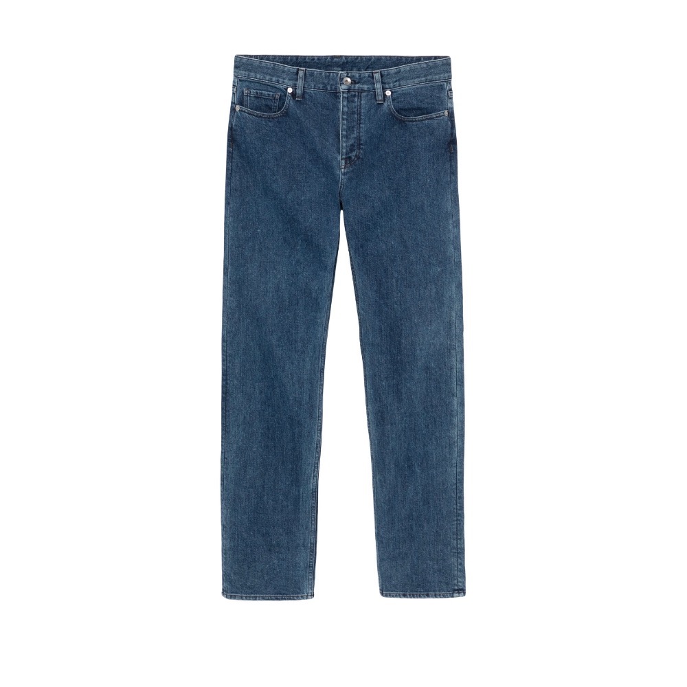 靛藍色 棉質混紡 牛仔 隱藏式拉鍊鈕釦開合 腰帶袢 經典五口袋 背面飾有logo貼花 修身剪裁