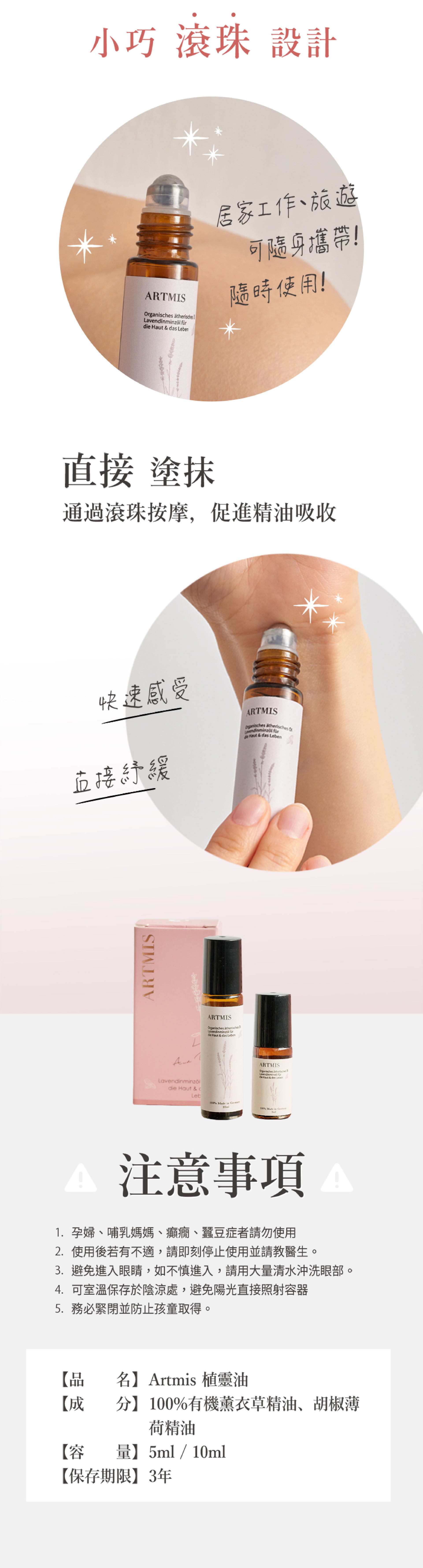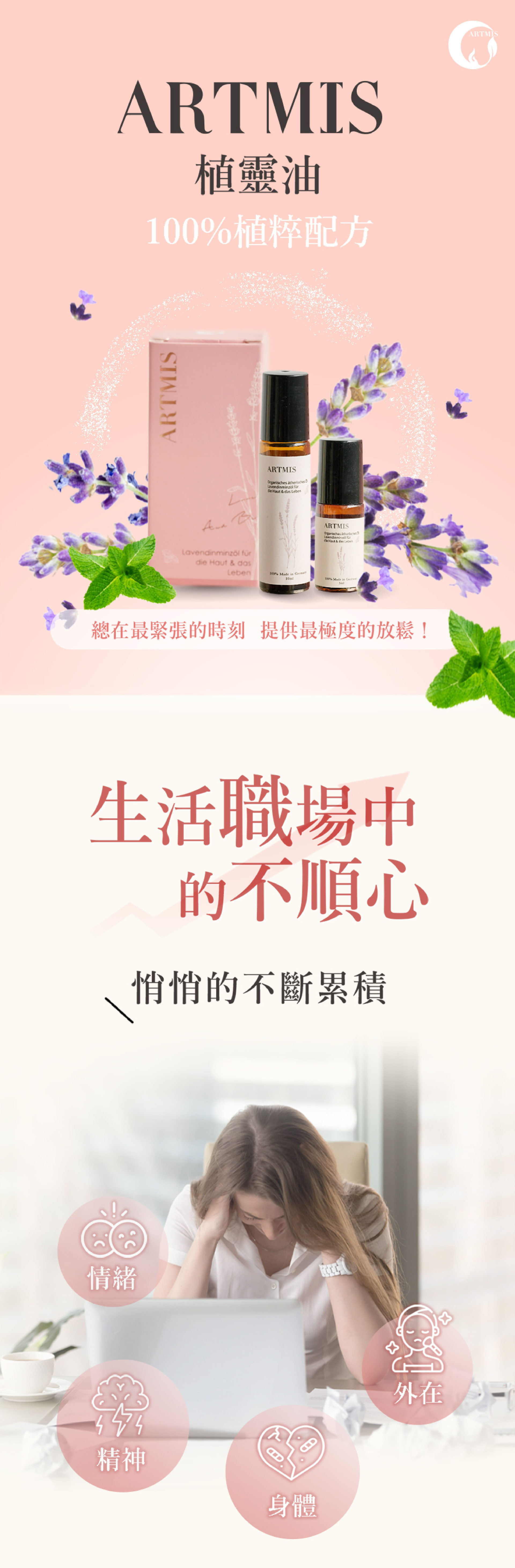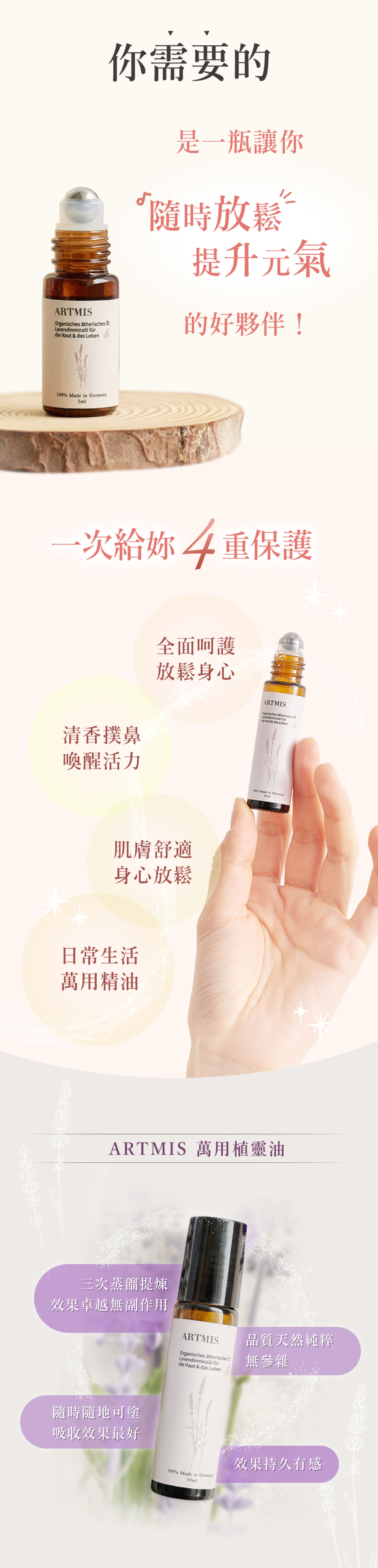 ARTMIS 植靈油結合德國製造專業芳療配方,選用 100% 有機認證薰衣草與胡椒薄荷精油,專為情緒調節、身體舒緩與精神提振設計。