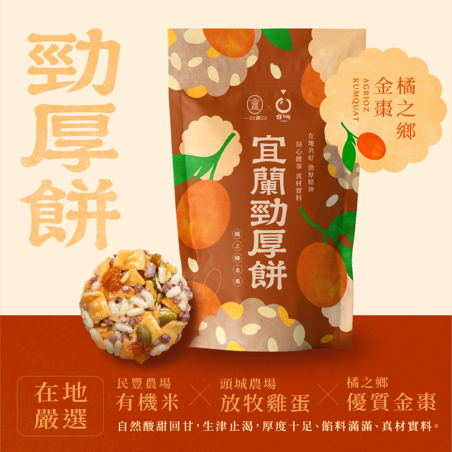 基底揉入「頭城農場」自然放牧雞蛋。雞隻在陽光充足、空間寬敞的環境中成長,食用無污染草料,產出的雞蛋純淨健康。蛋香與米香交織,成就了勁厚餅最純粹的酥脆口感。