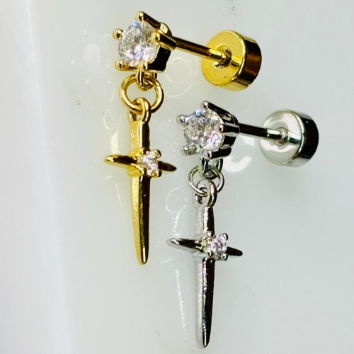 1007MA【小確幸飾品】醫療鋼鎖珠耳環 抗過敏 不退色 5A鋯石 貼耳 輕奢 日韓 百搭 金色 銀色 白鋯 十字