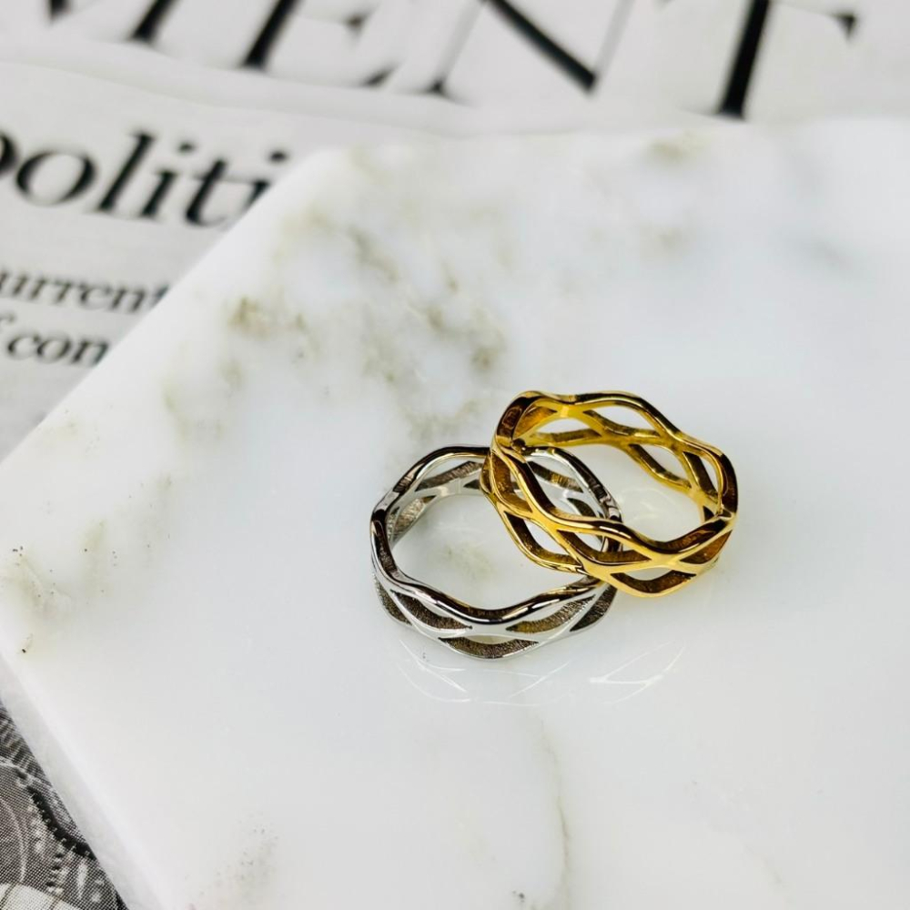 4086MA【小確幸飾品】鈦鋼戒指 抗過敏 不褪色 防水 耐磨 固定戒圍 質感 鏤空 交叉 流線 金色 銀色 戒寬6mm
