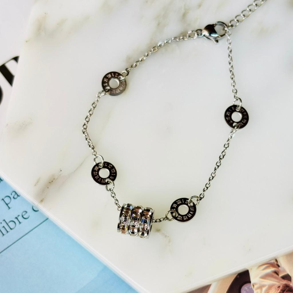 3005MA【小確幸飾品】鈦鋼手鍊 鈦鋼 醫療剛 抗過敏 不褪色 小蠻腰 三層 白鋯 羅馬數字 日韓 輕奢 龍蝦扣