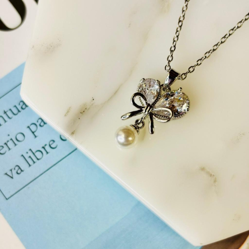 2037MA鈦鋼項鍊 小確幸飾品 鈦鋼 醫療剛 抗過敏 不褪色 銀色 愛心 蝴蝶結 白鋯 貝珠 日韓 流行 輕奢 百搭