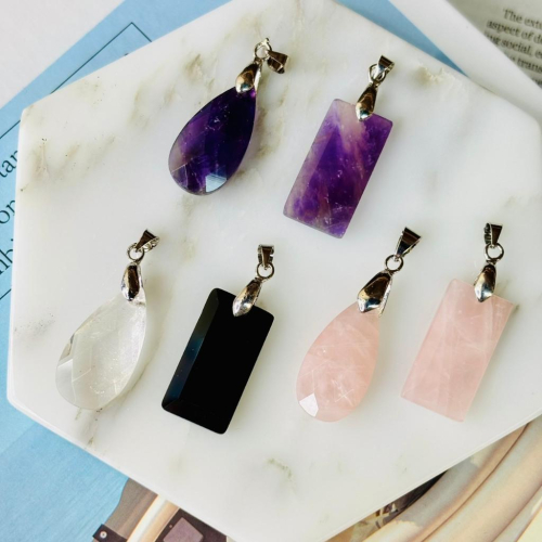 8201JA【小確幸飾品】天然水晶吊墜 水滴 無事牌 白水晶 黑曜石 粉水晶 紫水晶