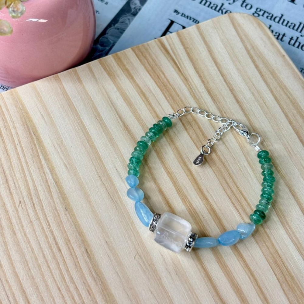 7308MY【小確幸飾品】心頻率 設計款水晶手鍊 白水晶 海藍寶 綠東陵石 五行金水木能量 頂輪喉輪心輪療癒 天然礦石