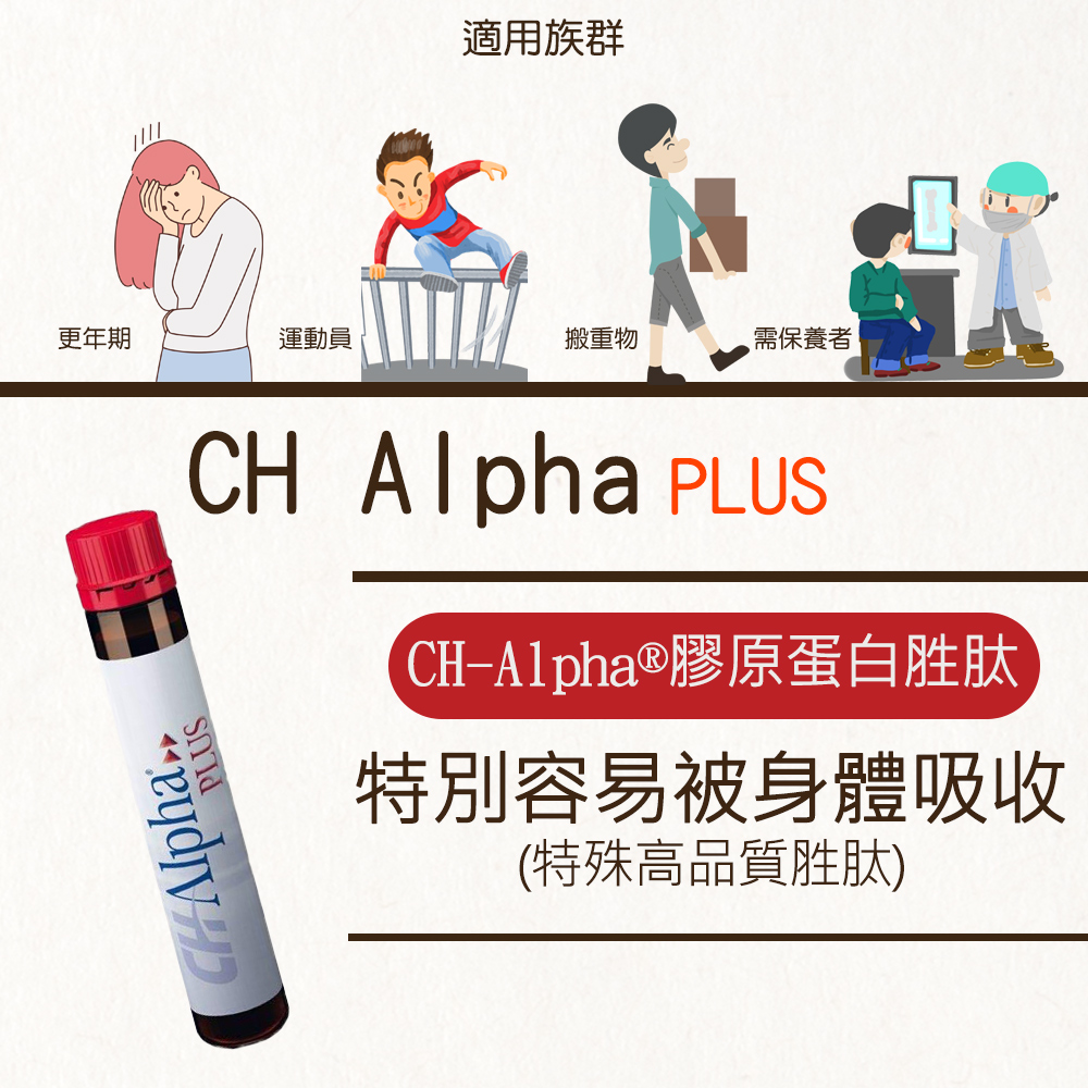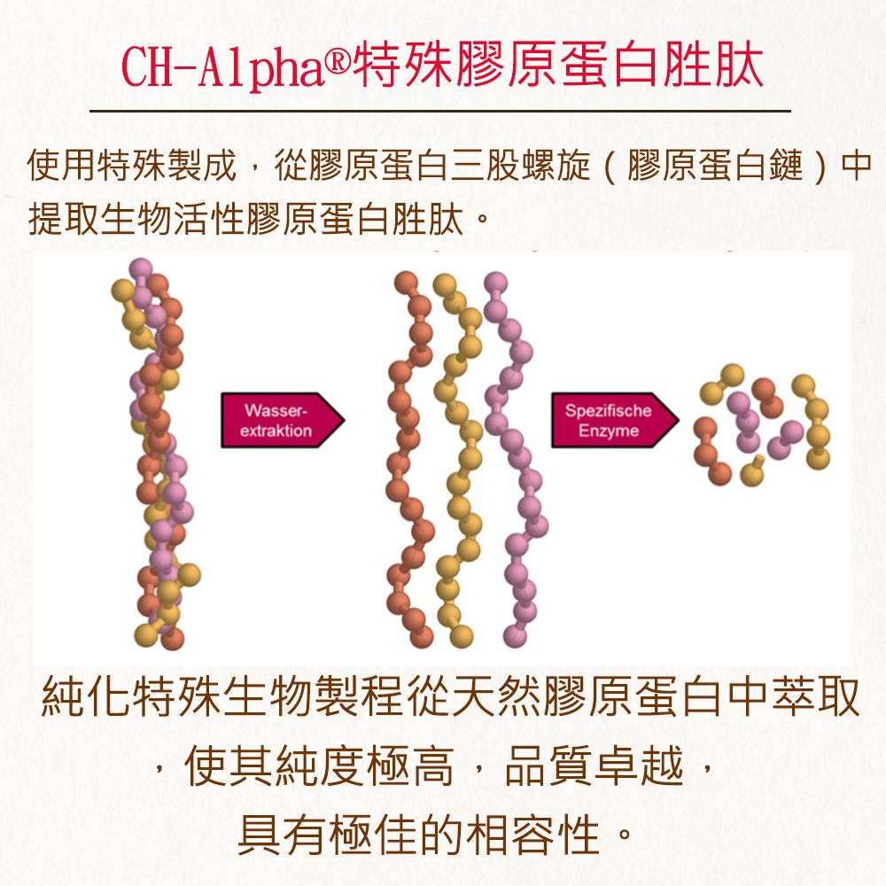 CH-Alpha®Plus含有膠原蛋白胜肽特殊品質的CH-Alpha®,這意味著所含的營養物質特別容易被身體有效吸收