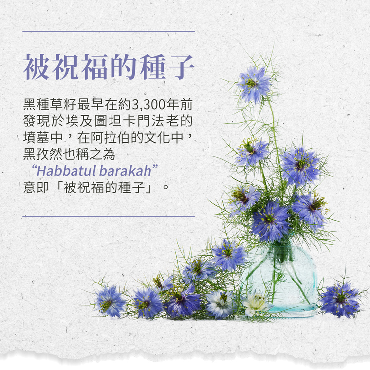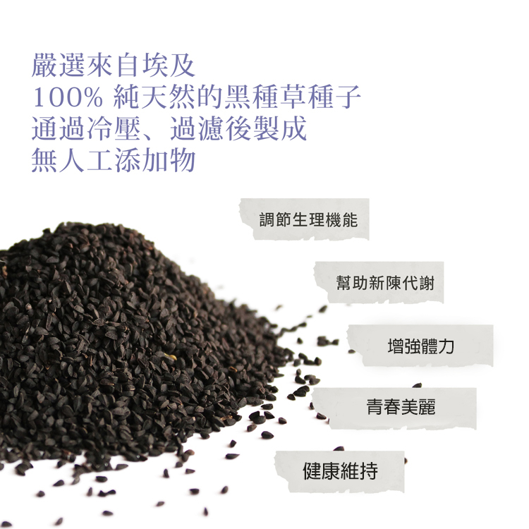 每粒膠囊含有500 毫克來自有機農業的純埃及黑孜然油,含有約 84%的生物活性不飽和脂肪酸。