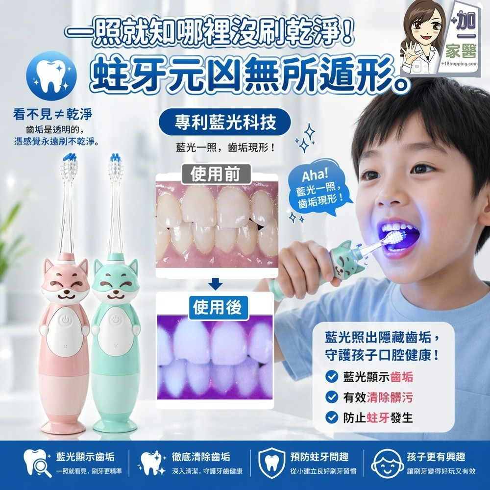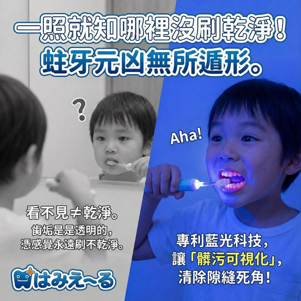 ▐ 不用塗抹任何化學藥品(如牙菌斑顯示劑),對小朋友及全家人健康沒有疑慮(沒有殘留誤食誤飲的問題),沒有清潔乾淨的齒垢或污漬照射後會立即顯示螢光紅色的反應。