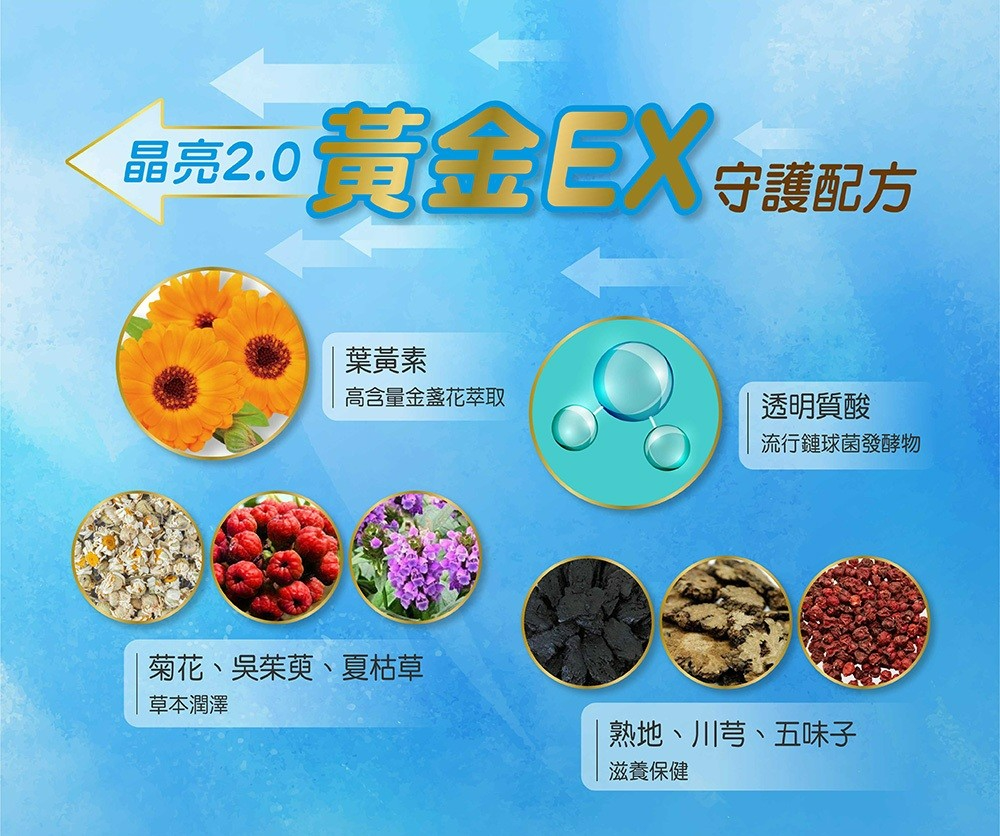 成分:金盞花萃取物〔糊精、金盞花萃取、阿拉伯膠、蔗糖、二氧化矽、玉米澱粉、維生素E(抗氧化劑)〕、麥芽糊精、乳糖、小米草萃取物(麥芽糊精、小米草)、羥丙基甲基纖維素、二氧化矽、硬脂酸鎂、流行鏈球菌發酵物(含透明質酸鈉)、玉米澱粉、菊花、吳茱萸、夏枯草、枸杞、熟地、川芎、白芍、五味子