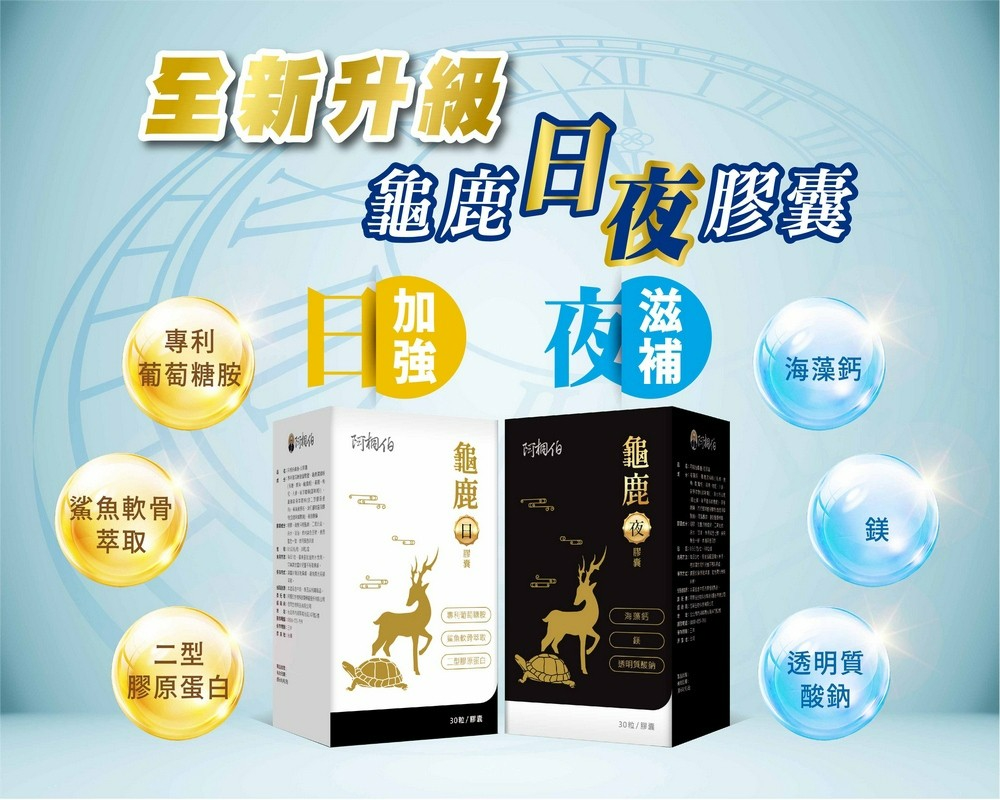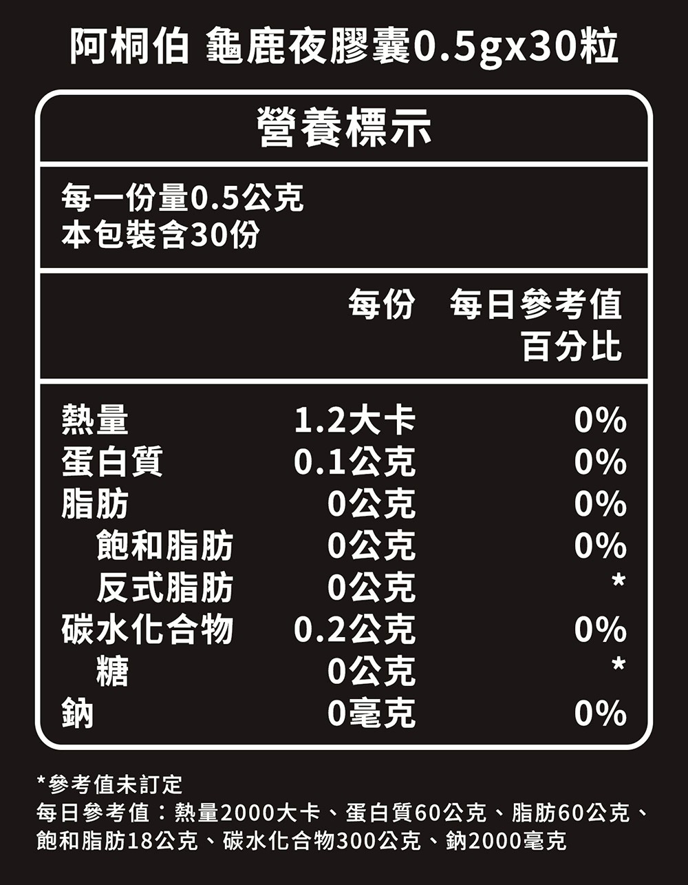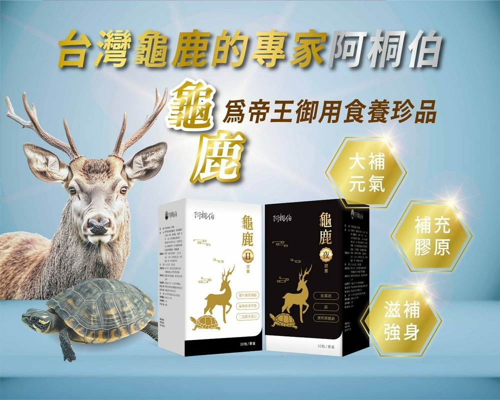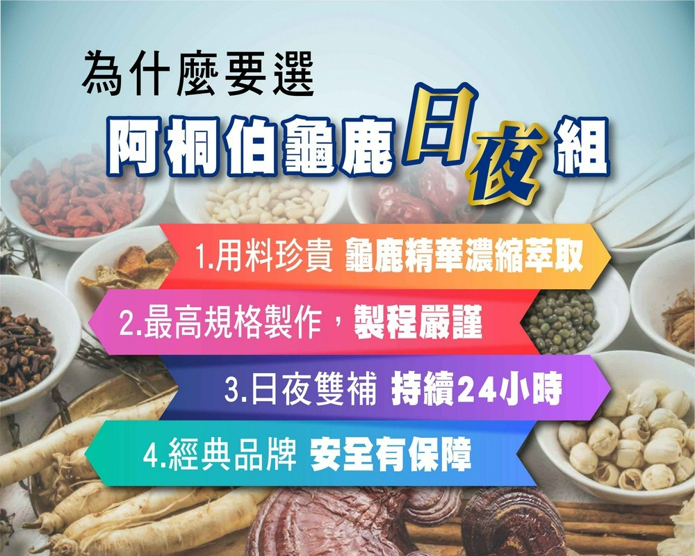 內容物:阿桐伯龜鹿日膠囊0.5gx30粒、阿桐伯龜鹿夜膠囊0.5gx30粒