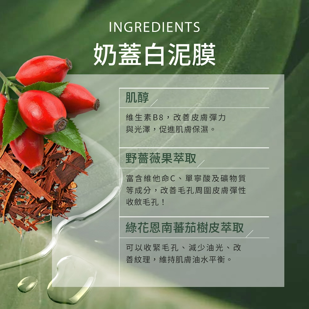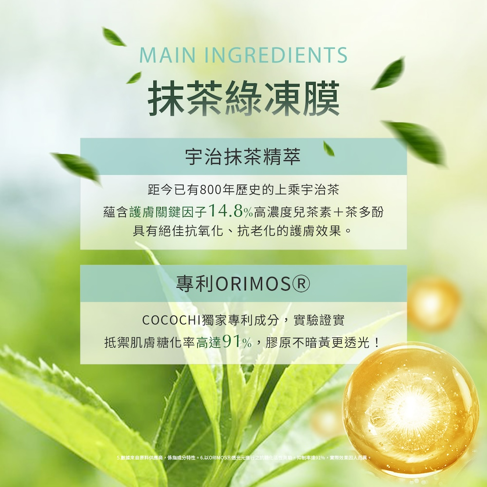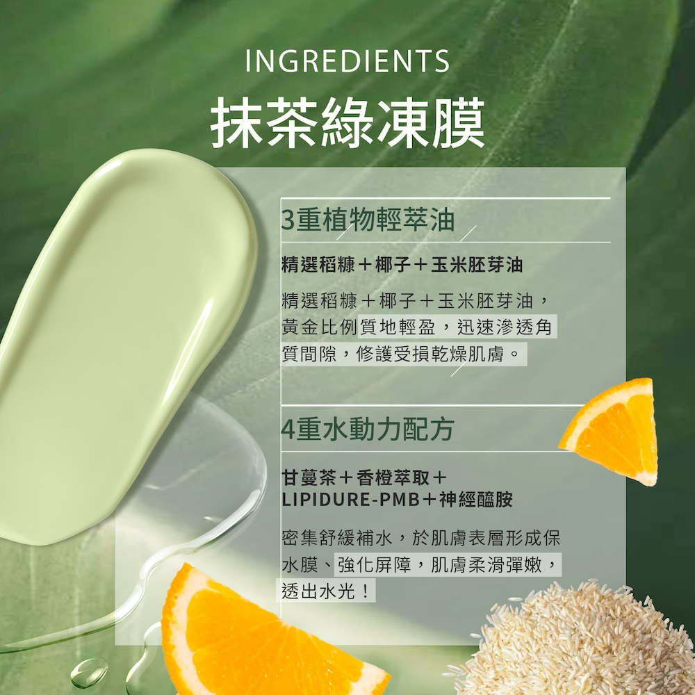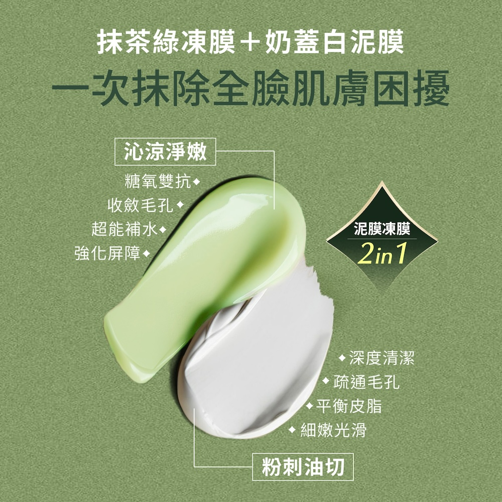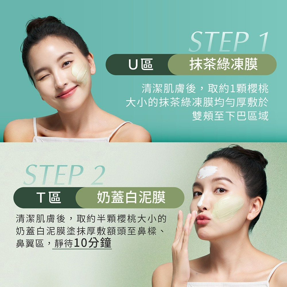 使用方式:清潔肌膚後,取適量(約1顆櫻桃大小)「抹茶綠凍膜」於掌心,避開眼部及唇部均勻塗抹,覆蓋於臉部U區或欲補水舒緩區域。再取出適量(約半顆櫻桃大小)「奶蓋白泥膜」避開眼唇塗抹於臉部。T區或欲深層清潔區域。塗抹完畢後靜待5~8分鐘,以指腹輕輕按摩臉部U區2~3分鐘,再用溫水沖洗乾淨,即可進行後續保養程序。