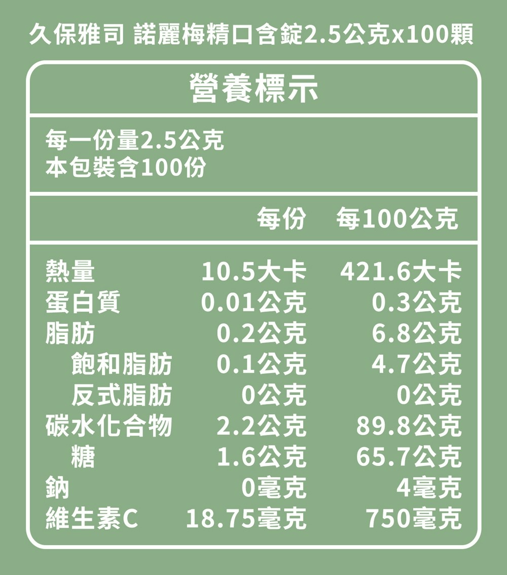 成分:砂糖、麥芽糖、椰子油、阿拉伯膠、檸檬酸(調味劑)、檸檬濃縮果汁、香料、維生素C、韓國梅濃縮液(精)、抹茶粉、諾麗果醱酵濃縮粉(冷凍乾燥)、香檬精華濃縮物(噴霧乾燥)、天然食用色素(梔子花綠色)、薄荷、棕櫚蠟(食品製造用劑)