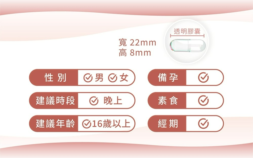 膠囊成份:羥丙基甲基纖維素、純水、鹿角菜膠、氯化鉀