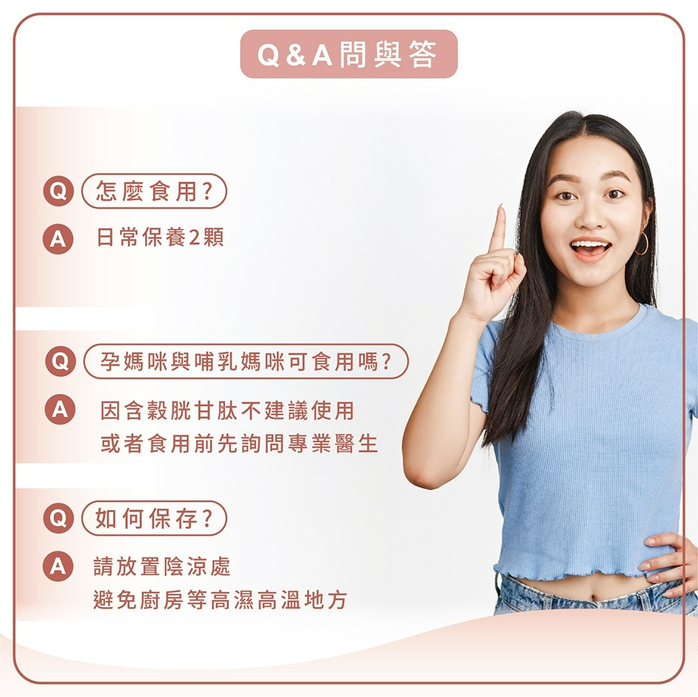 01.本產品含有圓酵母(Torula yeast)發酵製成之穀胱甘肽(Glutathione)對穀胱甘肽過敏者、孕婦、哺乳婦女及嬰幼兒應避免食用。