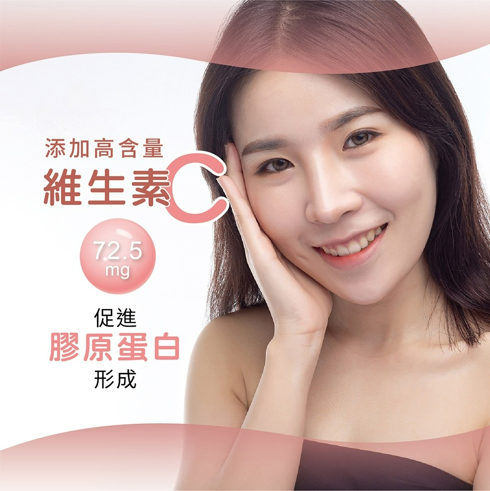 成分:OPITAC®穀胱甘肽、義大利血橙萃取粉(血橙萃取、麥芽糊精)、維生素C、西印度櫻桃萃取粉(麥芽糊精、維生素C、西印度櫻桃萃取物)、Oricera®玄米萃取物(玉米糊精、玄米抽出物(含神經醯胺))、微結晶狀α-纖維素、麥芽糊精、啤酒酵母萃取(含綜合B群)、日本專利玫瑰花瓣萃取(含多酚)、黑胡椒萃取物(含胡椒鹼)