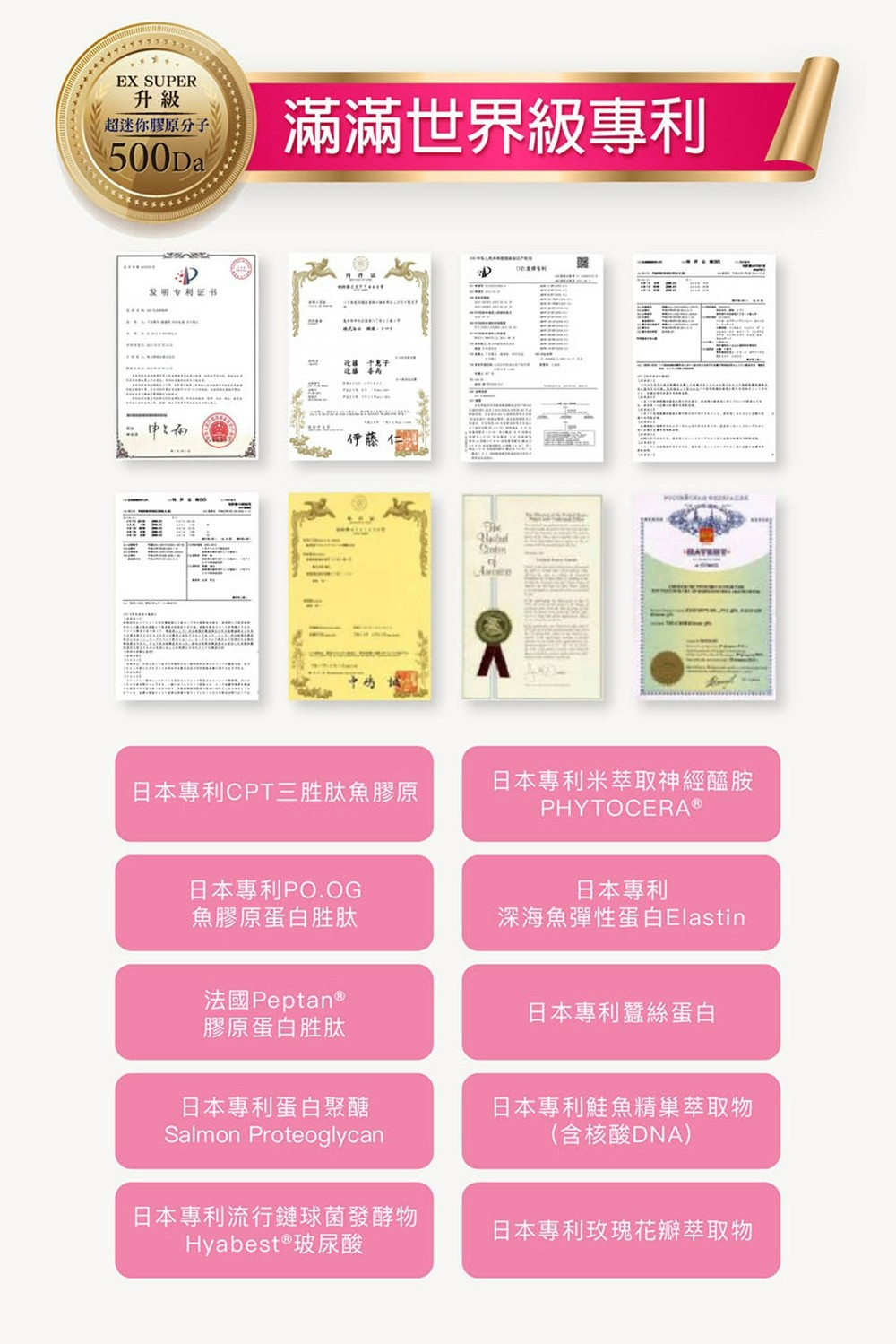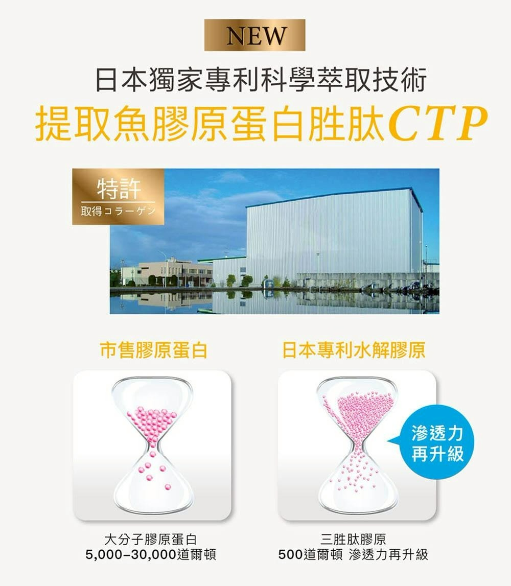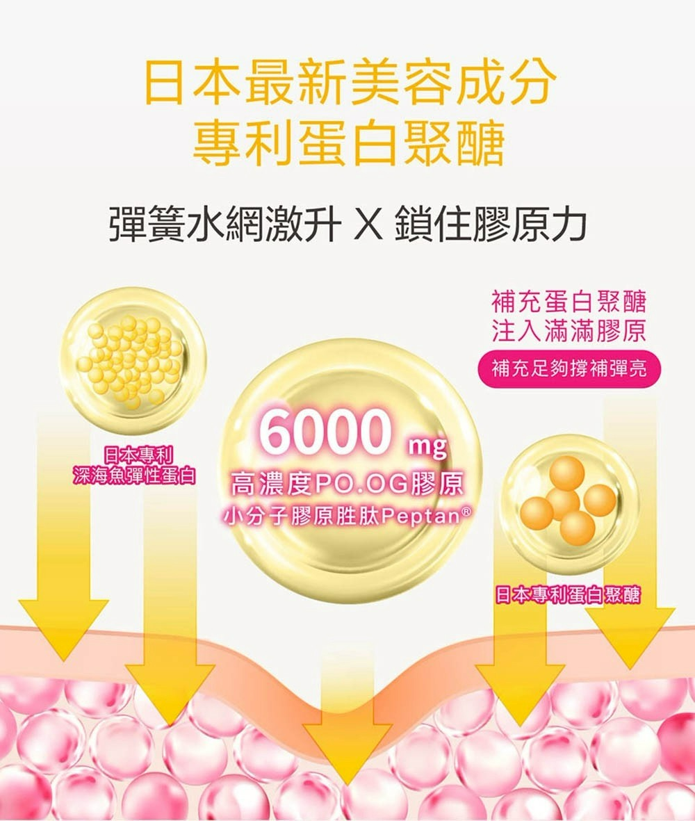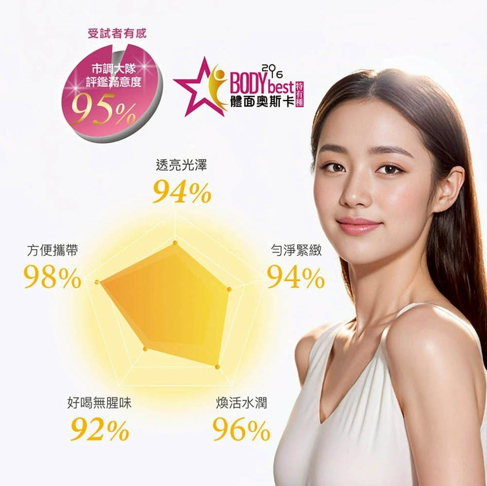 成分:膠原蛋白(法國小分子膠原蛋白胜肽Peptan®)、日本專利魚膠原蛋白(含PO.OG膠原蛋白胜肽)、檸檬果汁粉、維生素C、日本專利CTP魚膠原蛋白(專利微分子三胜肽)、專利深海魚膠原蛋白(含彈力蛋白)、檸檬酸、檸檬香料、日本專利穀胱甘肽(圓酵母來源)、酪蛋白水解物(含酪蛋白磷酸胜肽)、專利余甘子萃取物、專利USL-20冰晶番茄萃取粉(番茄萃取物、麥芽糊精)、專利葡萄萃取物(含白藜蘆醇)、法國西印度櫻桃萃取物(麥芽糊精、西印度櫻桃萃取維生素C)、維生素E、日本專利流行鏈球菌發酵物(含Hyabest®玻尿酸)、日本專利蠶絲蛋白胜肽(蠶絲蛋白、樹薯糊精)、日本專利鮭魚抽出物(含蛋白聚醣)、日本專利米胚芽萃取物(含神經醯胺)、專利SCS-20血橙萃取粉