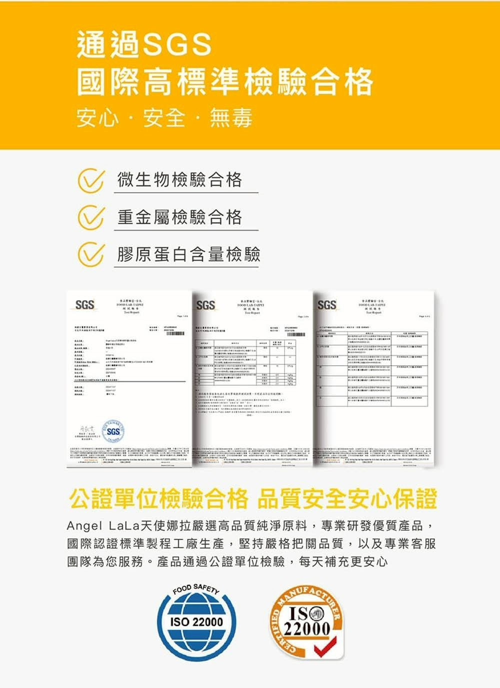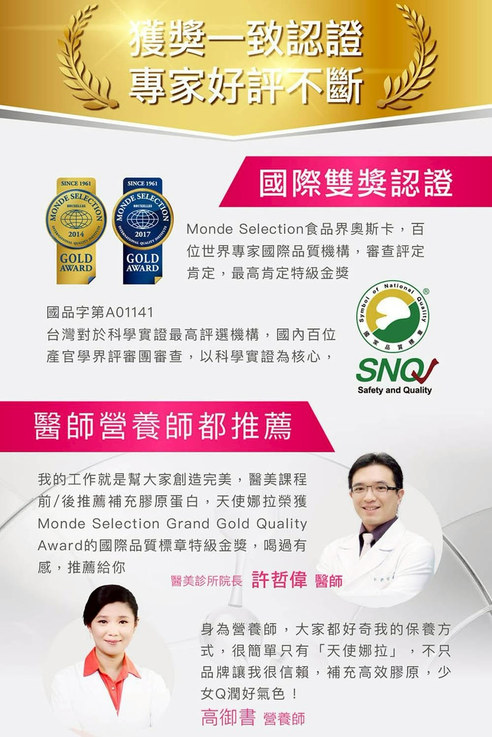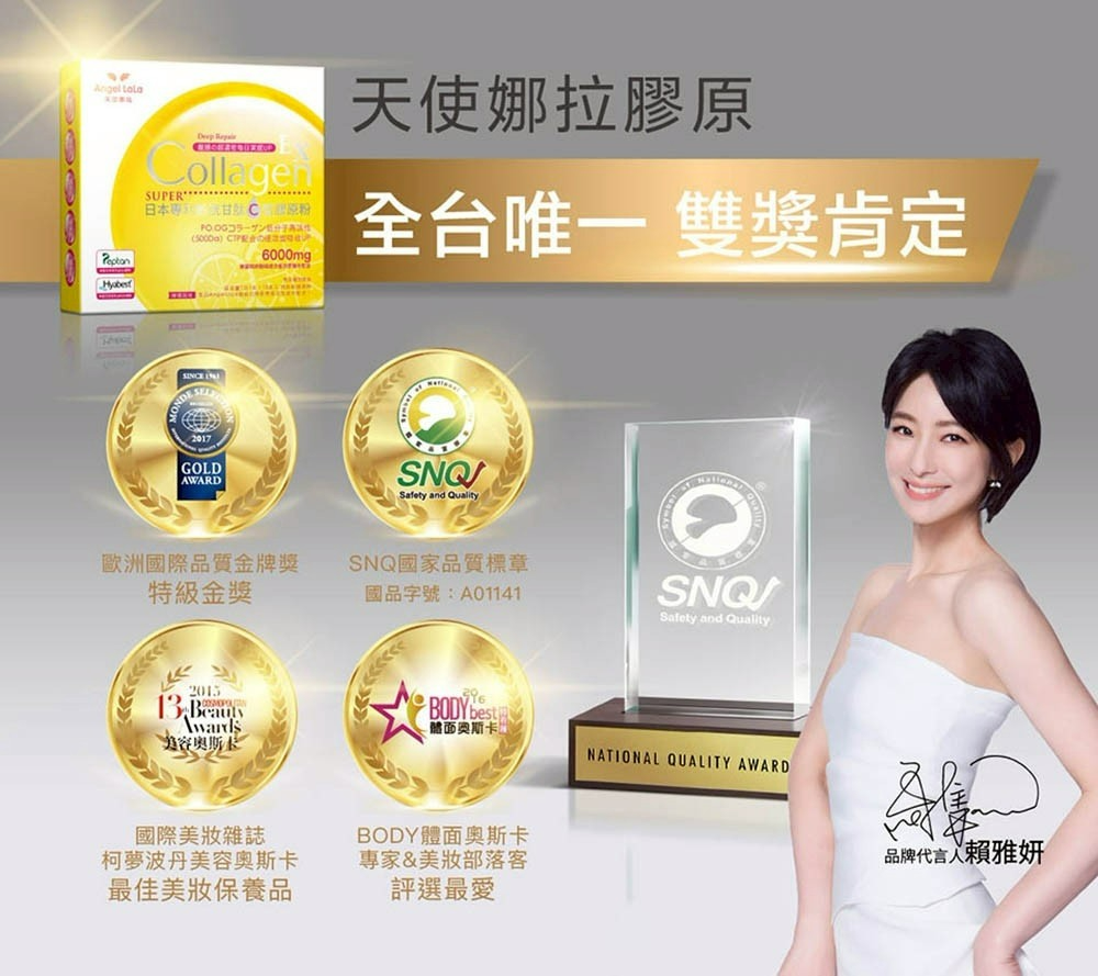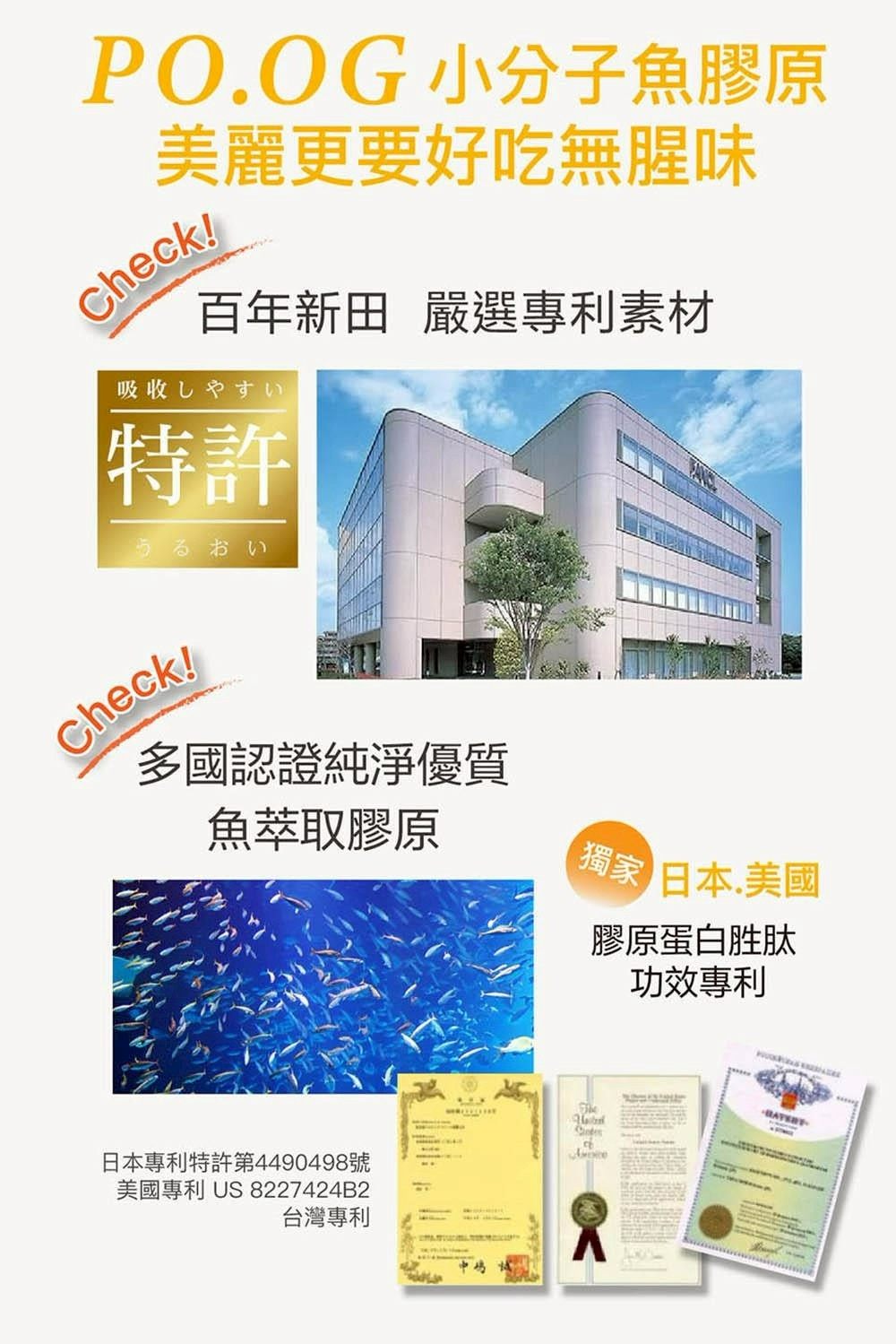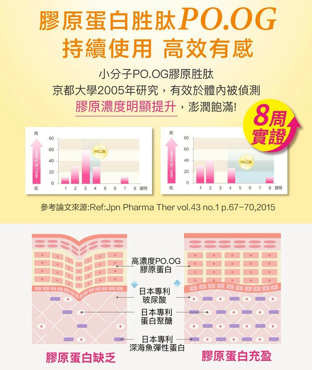 成分:膠原蛋白(法國小分子膠原蛋白胜肽Peptan®)、日本專利魚膠原蛋白(含PO.OG膠原蛋白胜肽)、檸檬果汁粉、維生素C、日本專利CTP魚膠原蛋白(專利微分子三胜肽)、專利深海魚膠原蛋白(含彈力蛋白)、檸檬酸、檸檬香料、日本專利穀胱甘肽(圓酵母來源)、酪蛋白水解物(含酪蛋白磷酸胜肽)、專利余甘子萃取物、專利USL-20冰晶番茄萃取粉(番茄萃取物、麥芽糊精)、專利葡萄萃取物(含白藜蘆醇)、法國西印度櫻桃萃取物(麥芽糊精、西印度櫻桃萃取維生素C)、維生素E、日本專利流行鏈球菌發酵物(含Hyabest®玻尿酸)、日本專利蠶絲蛋白胜肽(蠶絲蛋白、樹薯糊精)、日本專利鮭魚抽出物(含蛋白聚醣)、日本專利米胚芽萃取物(含神經醯胺)、專利SCS-20血橙萃取粉
