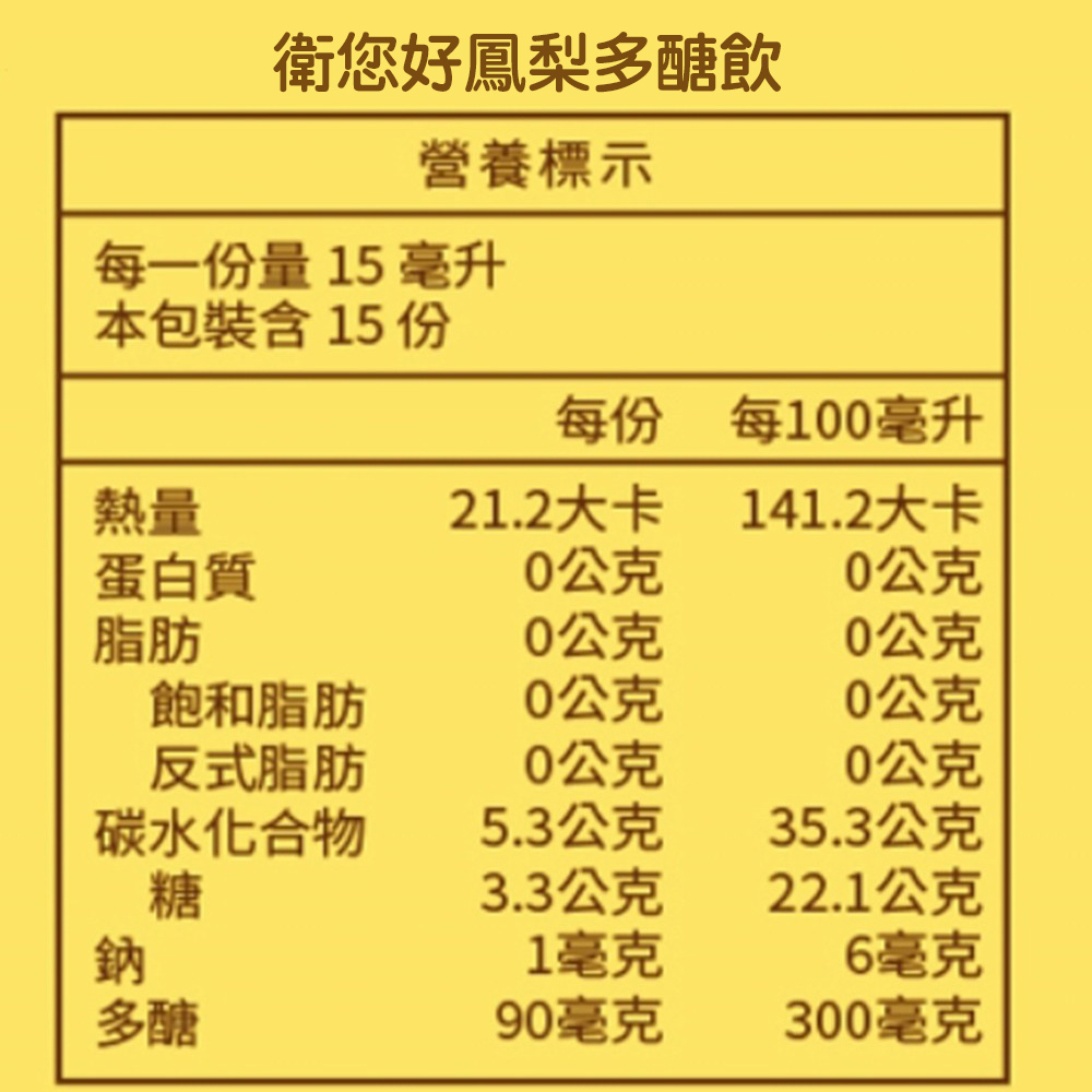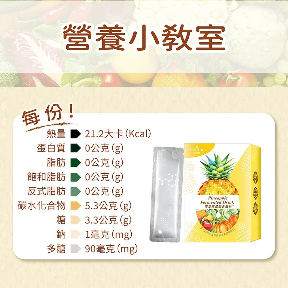 成分:鳳梨發酵液(異麥芽寡糖、鳳梨發酵液、黑糖(蔗糖、糖蜜))、水、蔬果醱酵液(鳳梨、蘿蔔、萵苣、蕪菁、甜瓜、薏仁、絲瓜、西瓜、芹菜、皇宮菜、菠菜、冬瓜、木瓜、哈密瓜、小白菜、海茸、檸檬、甘藍、南瓜、番茄)、綜合消化酵素(蛋白酵素、麥芽糊精、澱粉酵素、糖化酵素、脂解酵素、轉化酵素、鳳梨酵素、纖維素分解酵素)、靈芝菌絲體(Ganoderma lucidum,液態發酵)。