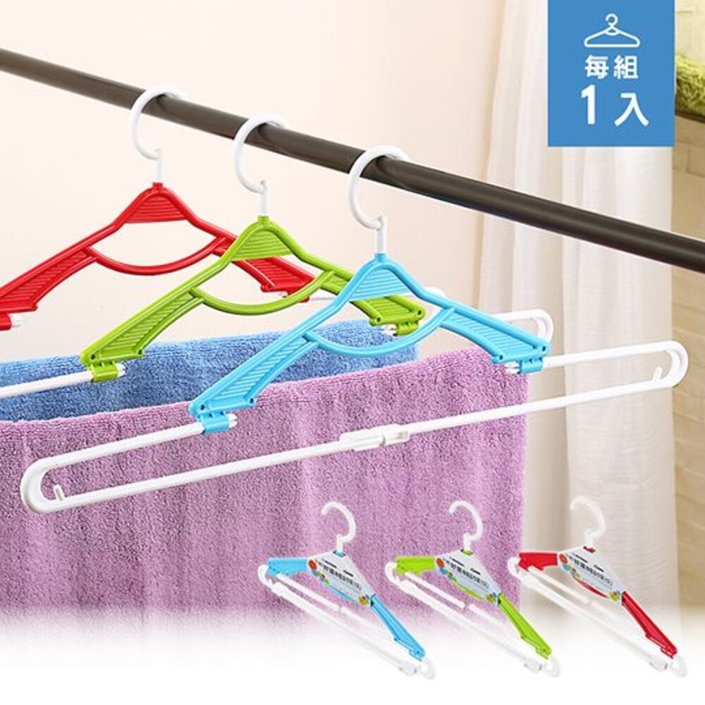 兩側伸縮式設計,領帶位、吊帶位設計,可吊掛領帶、皮帶、細肩帶衣裙等衣物,可旋轉式掛勾,更靈活方便;適用於小浴巾、大小衣物,有自由水藍、活力綠、熱情紅,可供挑選。