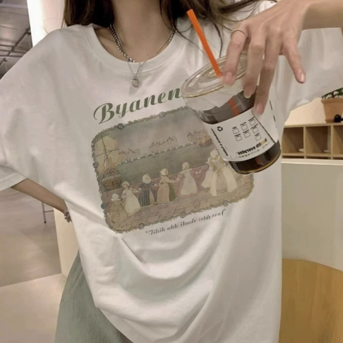 ✨台灣現貨✨100%純棉古典華爾滋短袖|可愛油畫風T恤|百搭白色正肩慵懶風|二色(白/奶黃)