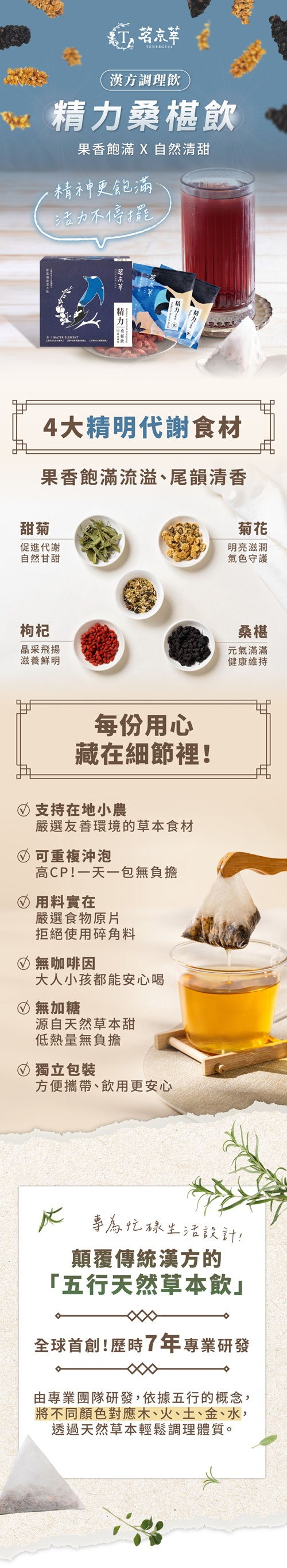 桑椹果與枸杞甜韻共同滋養,果實香氣透過熱萃而飽滿流溢,輔以菊花香氣作結