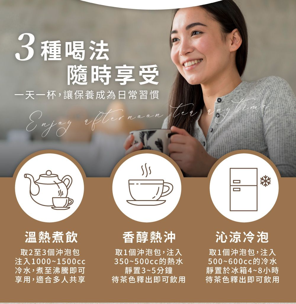 取茶包放入杯中以350-500c.c.100度熱水,沖泡3-5分鐘,待茶色釋出後,即可飲用