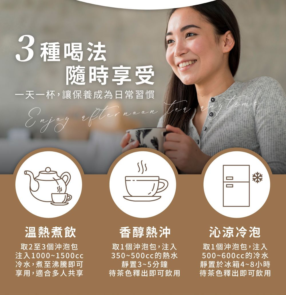 取茶包放入杯中以350-500c.c.100度熱水,沖泡3-5分鐘,待茶色釋出後,即可飲用