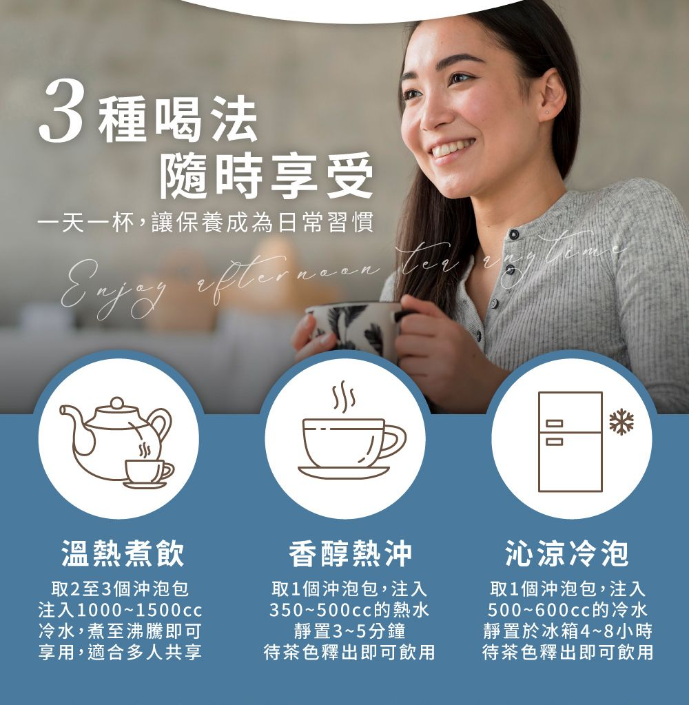 取茶包放入杯中以350-500c.c.100度熱水,沖泡3-5分鐘,待茶色釋出後,即可飲用