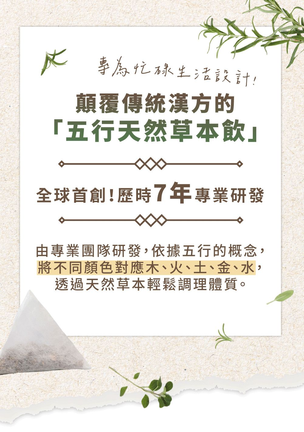 蘊含了大自然五種元素的能量,將您引導回平衡與寧靜的核心。無論您是想要片刻的放鬆,還是尋找創意的靈感,五行茶都能伴您一路同行