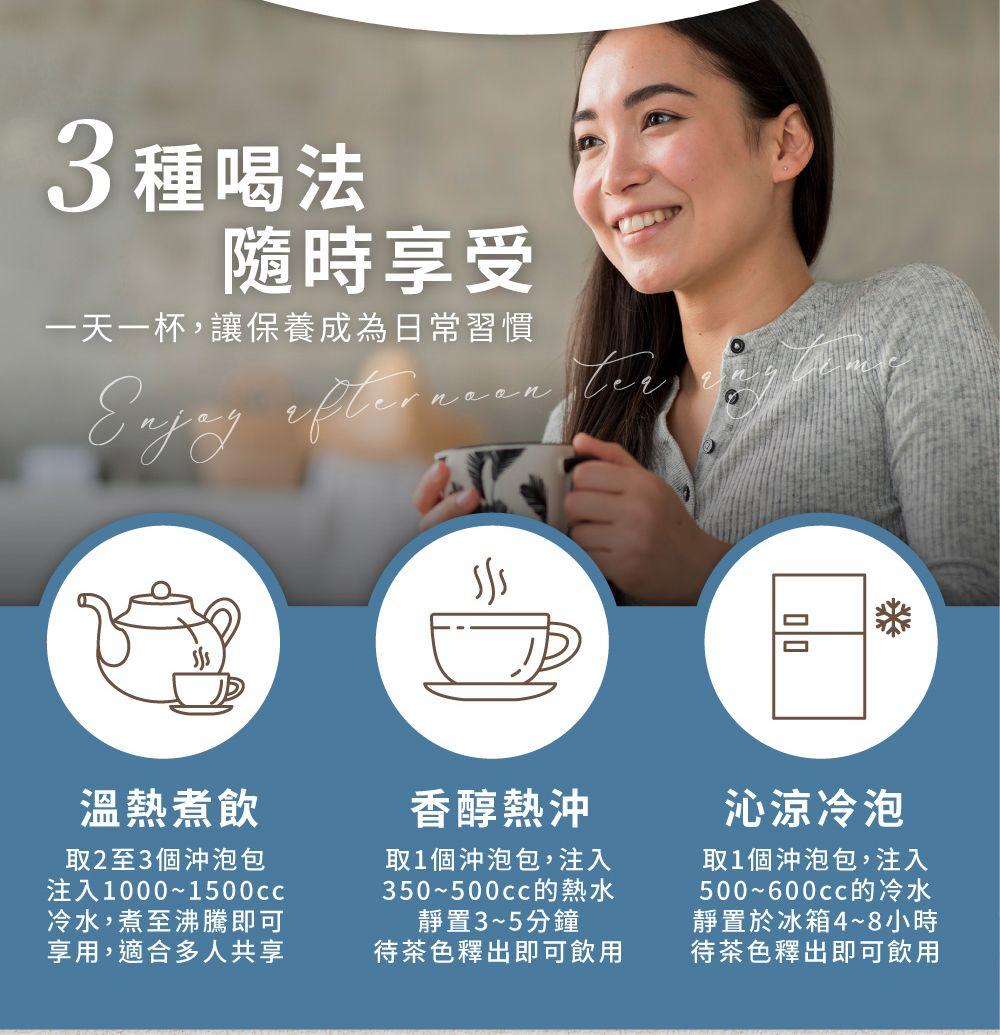 取茶包放入杯中以350-500c.c.100度熱水,沖泡3-5分鐘,待茶色釋出後,即可飲用