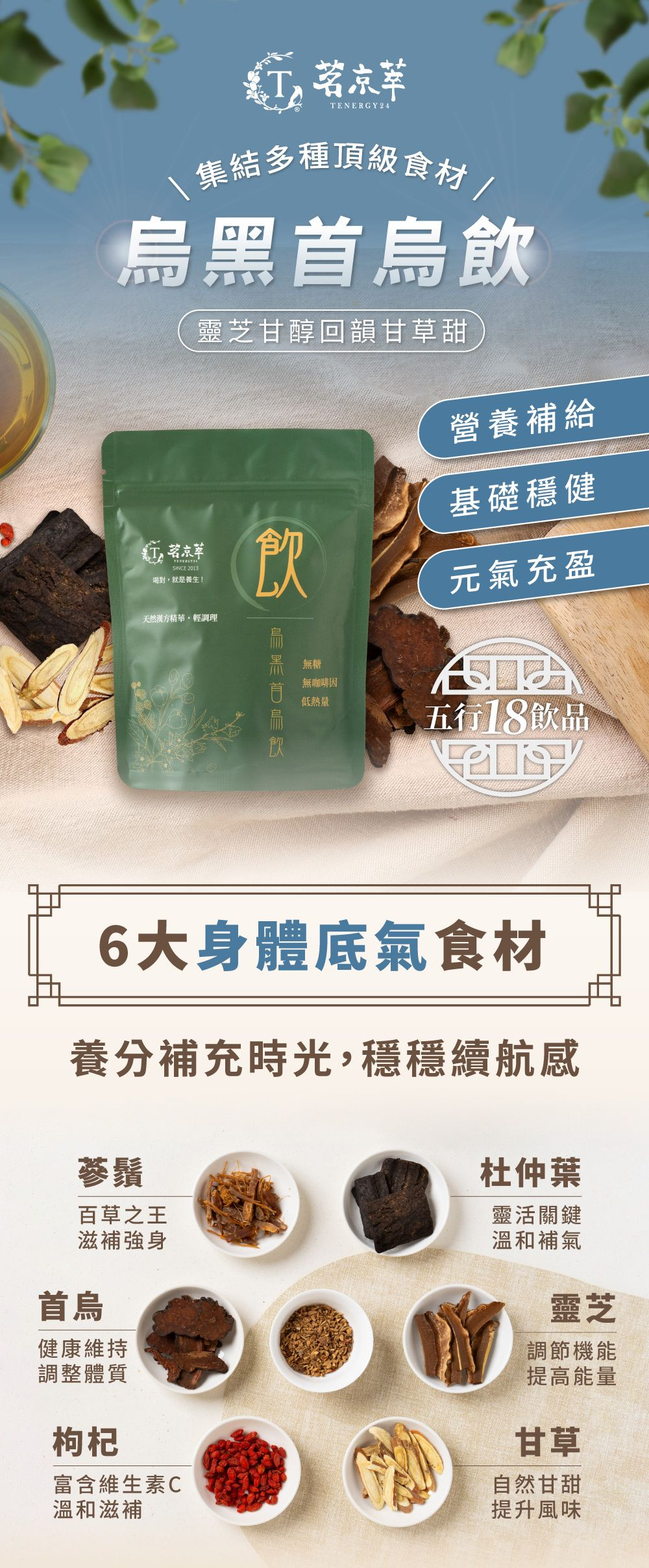 成分:靈芝‧首烏‧杜仲葉‧參鬚‧枸杞‧甘草