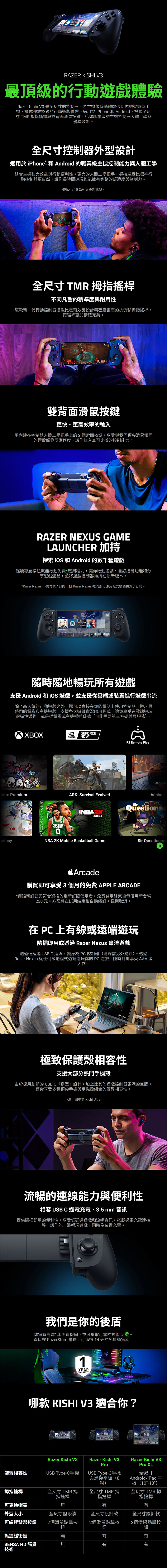 Razer Kishi V3 是全尺寸的控制器,將主機級遊戲體驗帶到你的智慧型手機,讓你釋放極致的行動遊戲體驗。適用於 iPhone 和 Android,搭載全尺寸 TMR 拇指搖桿與雙背面滑鼠按鍵,給你職業級的主機控制器人體工學與優異效能。