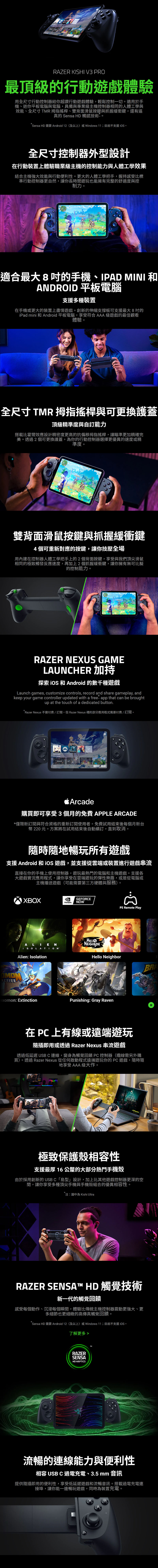 用全尺寸行動控制器給你超讚行動遊戲體驗,輕鬆控制一切。適用於手機、迷你平板電腦與電腦,具備與專業級主機控制器相同的人體工學與效能、全尺寸 TMR 拇指搖桿、雙背面滑鼠按鍵與抓握緩衝鍵,還有逼真的 Sensa HD 觸感技術。