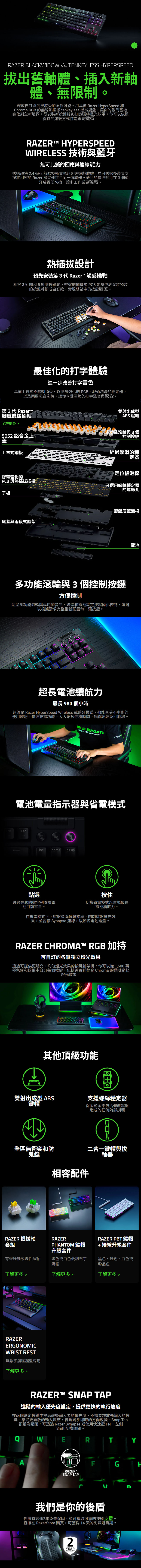 釋放自訂與沉浸感受的全新可能。用具備 Razer HyperSpeed 和 Chroma RGB 的無線熱插拔 tenkeyless 機械鍵盤,讓你的戰鬥基地進化到全新境界。從安裝新按鍵軸到打造獨特燈光效果,你可以依照喜愛的遊玩方式打造專屬鍵盤。