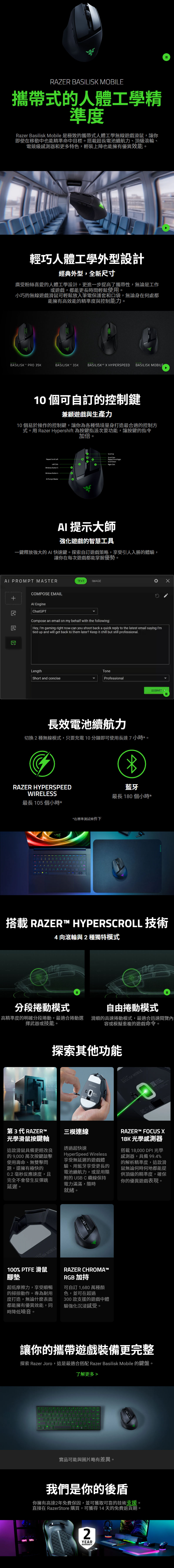 Razer Basilisk Mobile 是極致的攜帶式人體工學無線遊戲滑鼠,讓你即使在移動中也能精準命中目標。搭載超長電池續航力、頂級滾輪、電競級感測器和更多特色,輕裝上陣也能擁有優異效能。