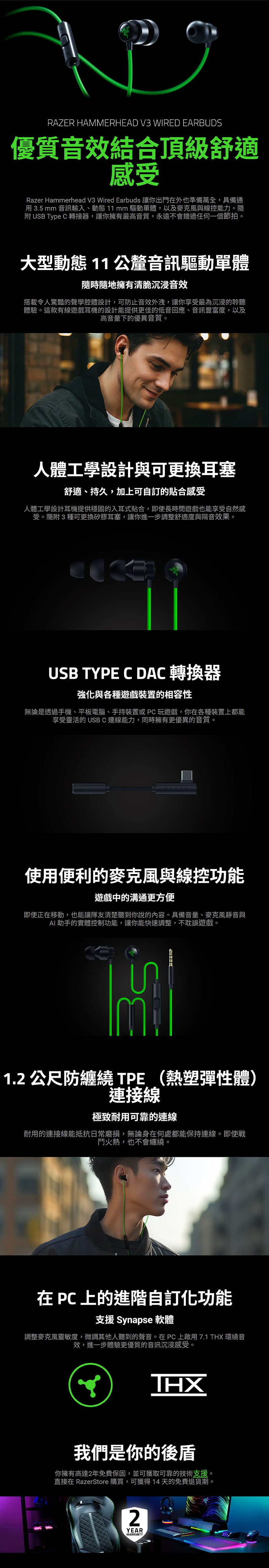 Razer Hammerhead V3 Wired Earbuds 讓你出門在外也準備萬全,具備通用 3.5 mm 音訊輸入、動態 11 mm 驅動單體,以及麥克風與線控能力。隨附 USB Type C 轉接器,讓你擁有最高音質,永遠不會錯過任何一個節拍。