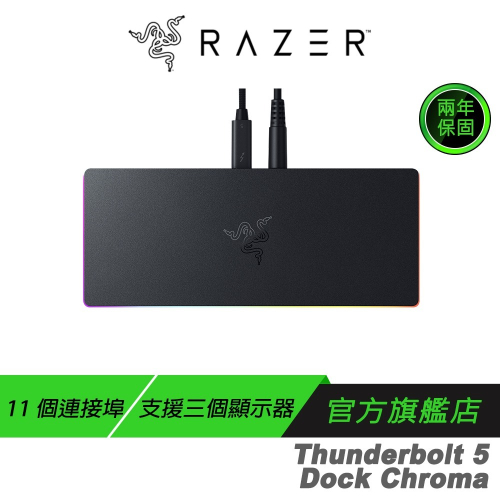 連接 Razer Thunderbolt™ 5 Dock Chroma,為你的桌上型電腦或筆記型電腦賦予優異的連線能力。透過單一強大的 Thunderbolt 連線,讓你擁有最快的傳輸速度、11 個連接埠、一個 M.2 儲存插槽、支援三個 4K 144 Hz 顯示器,以及可實現無限燈光可能的 Razer Chroma,滿足你的一切需求。