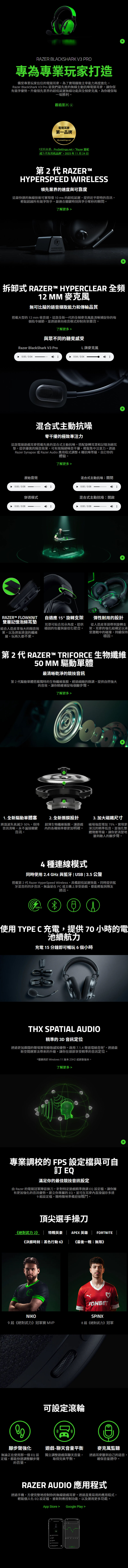 備受專業玩家信任的電競耳麥,為了實現極致主宰能力再度進化。Razer BlackShark V3 Pro 是我們最先進的無線主動抗噪電競耳麥,讓你保有競爭優勢。升級領先業界的超低延遲無線功能與全頻麥克風,為你確保每一場勝利。