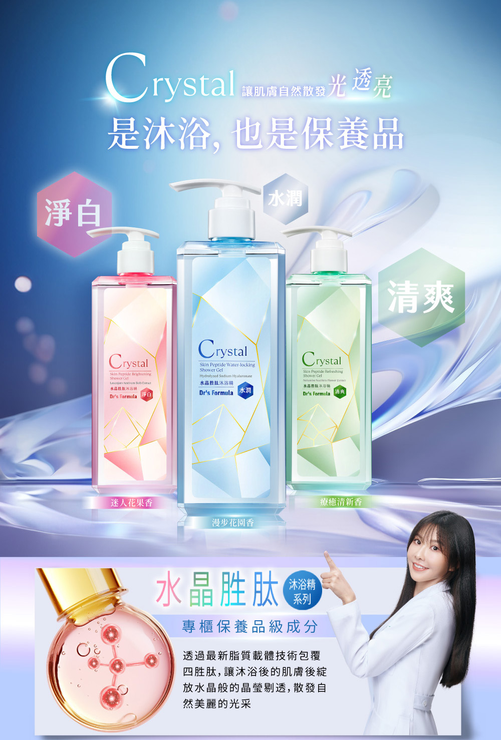 水晶胜肽透過最新脂質載體技術,包覆四胜肽,讓沐浴後的肌膚後綻放水晶般的晶瑩剔透,散發自然美麗的光采。