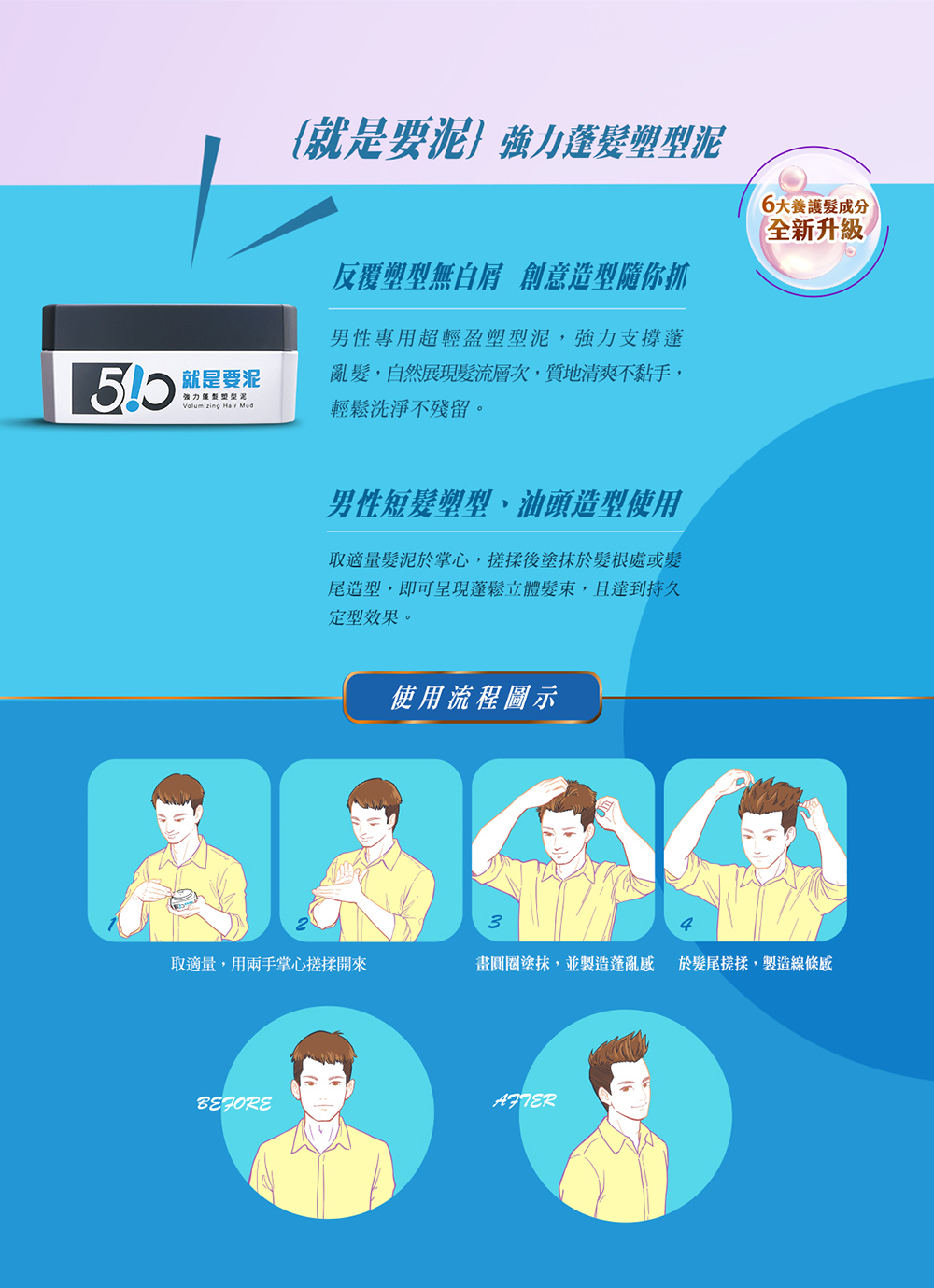 用法:取適量髮泥於掌心,搓揉後塗抹於髮根處或髮尾造型,即可呈現蓬鬆立體髮束,且達到持久定型效果。