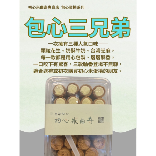 一次擁有三種人氣口味——顆粒花生、奶酥牛奶、台灣芝麻,每一款都是用心包製、層層酥香,一口咬下有驚喜,三款輪番登場不無聊,適合送禮或初次購買初心米蛋捲的朋友。