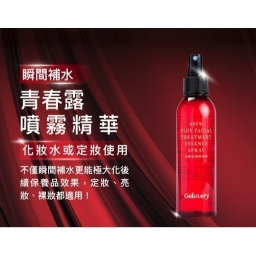 添加5%的Gelovery 400%青春露PLUS原液, 讓臉部淨、透、亮、白、嫩、滑, 不僅瞬間補水更能極大化後續保養品效果,定妝、亮妝、裸妝都適用!