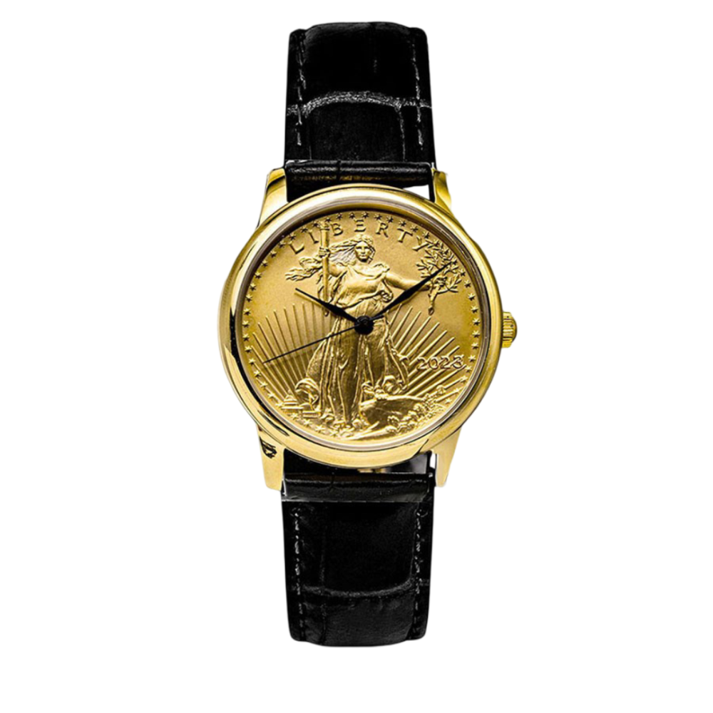 - 美國1/4盎司金鷹幣作為錶面主體,採用金色鍍層錶殼,搭配高級真皮錶帶,彰顯奢華質感。