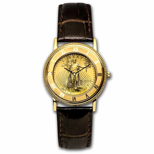 - 採用 美國金鷹幣鑄造錶面,搭配金色鍍層錶殼與高級真皮錶帶,展現尊貴奢華質感。