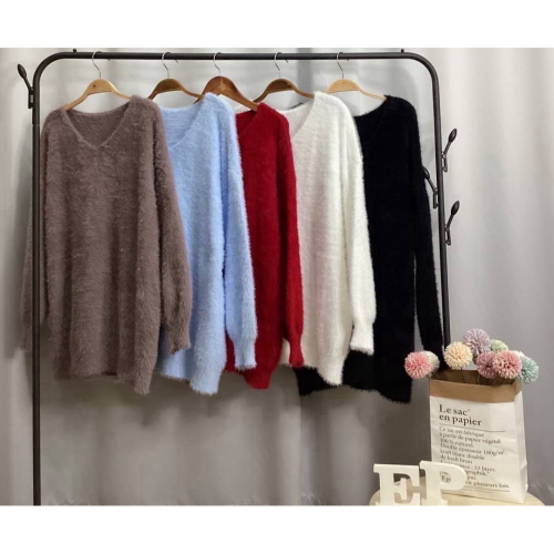 Pin Pin 家 溫柔甜美V領寬鬆慵懶水貂毛中長款毛衣 #2090