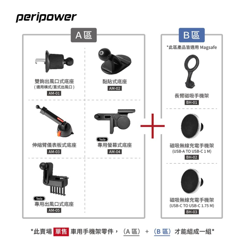 peripower BH-01 長臂磁吸手機架-適用 MagSafe   peripower BH-02 磁吸無線充電手機架-適用 MagSafe(USB-A TO USB-C 1 M) NCC:CCAH24LP0580T5 peripower BH-03 磁吸無線充電手機架-適用 MagSafe(USB-C TO USB-C 1.75 M) NCC:CCAH24LP0581T7 【商品說明】 多種配件可供選擇 根據需求自由搭配 單獨出售各種配件 (A 區) + (B 區)=才能組成一組 手機底座(A 區) 需搭配手機磁吸座(B 區) 為一組才可使用 (B 區)BH-01 長臂磁吸手機架-適用 MagSafe   .無法單獨使用,需搭配手機底座(A 區) .適用於 MagSafe 磁吸系列機型與磁吸手機殼 .採用 20 顆 N52H 磁鐵,穩固吸附手機 .適用於不支援 MagSafe 磁吸功能的装置 .MagSafe 端可橫軸 360 度旋轉,輕鬆調整角度 .可搭配於所有 17 mm 球頭的底座 (B 區)BH-02 磁吸無線充電手機架-適用 MagSafe(USB-A TO USB-C 1 M) .無法單獨使用,需搭配手機底座(A 區) .適用於 MagSafe 磁吸系列機型與磁吸手機殼 .輸出功率最高可達 15W .保護手機不刮傷,防止手機滑落 .白光呼吸燈,方便夜晚辨識支架位置 .1M USB-A to C 充電線,適用大多數車型,堅實耐用 .可搭配於所有 17 mm 球頭的底座 (B 區)BH-03 磁吸無線充電手機架-適用 MagSafe(USB-C TO USB-C 1.75 M) .無法單獨使用,需搭配手機底座(A 區) .適用於 MagSafe 磁吸系列機型與磁吸手機殼 .採用橡膠材質,保護手機不刮傷 .白光呼吸燈,方便夜晚辨識支架位置 .專為 Tesla 設計的 1.75 M 雙 USB-C 充電線 .可搭配於所有 17 mm 球頭的底座 產地:中國 【注意事項】 *(A 區) + (B 區) = 一組,單選(A 區)或(B 區)為單售零件 *球體直徑:17mm *免責聲明:本賣場僅販售商品,不包含安裝服務。若手機因掉落受損,本賣場不負賠償責任