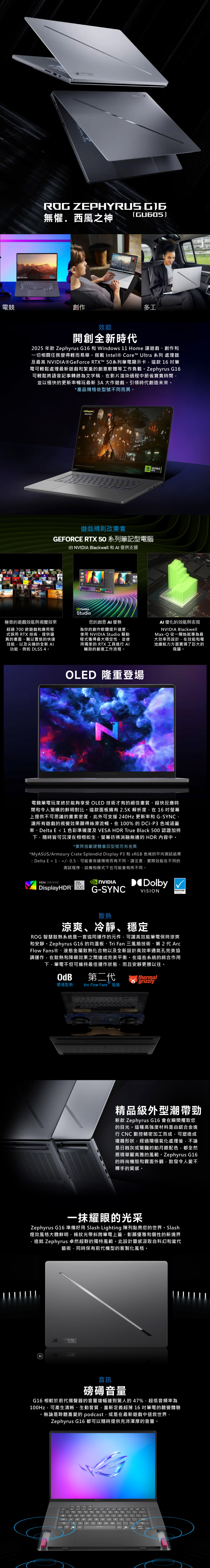 螢幕:OLED 16吋16:10(薄邊框) / 2.5K (2560 x 1600, WQXGA) / 240Hz / 0.2ms / 對比度 100萬:1 / DCI-P3 % 100% / G-Sync / Pantone 認證 / Dolby Vision HDR / ROG Nebula Display