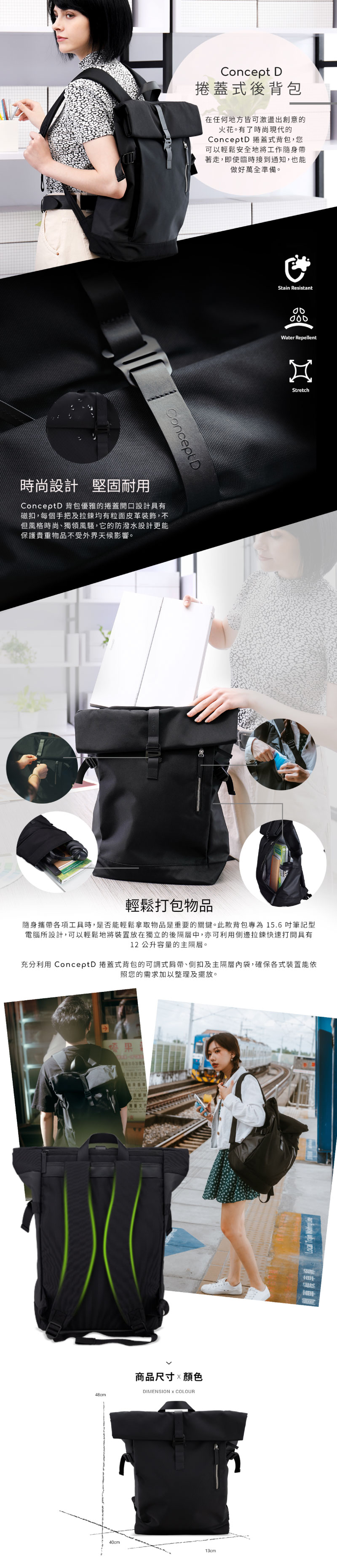 不但耐用,且時尚不打折。ConceptD 背包優雅的捲蓋開口設計具有磁扣,每個手把及拉鍊均有粒面皮革裝飾,不但風格時尚、獨領風騷,它的防潑水設計更能保護貴重物品不受外界天候影響
