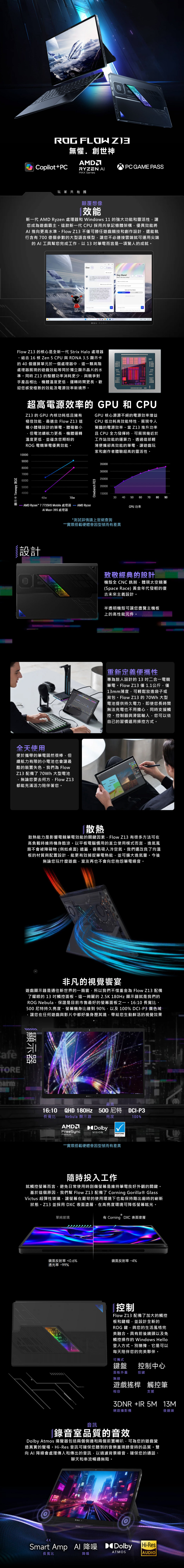 螢幕:13.4 吋(薄邊框) / 2.5K (2560 x 1600, WQXGA) / 180Hz / IPS-level / DCI-P3 100% / Adaptive-Sync / Pantone 認證/Dolby Vision/Glossy display (觸控)