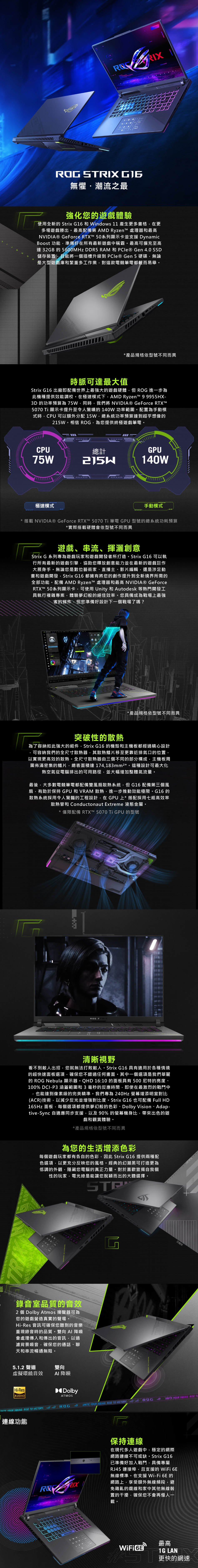 螢幕:1616:10(薄邊框) / 2.5K (2560 x 1600, WQXGA) 16:10 /165Hz / IPS-level / 3ms / DCI-P3 % 100% / G-Sync / Pantone 認證 / Anti-glare / Dolby Vision HDR / ROG Nebula Display / 1080P FHD Camera